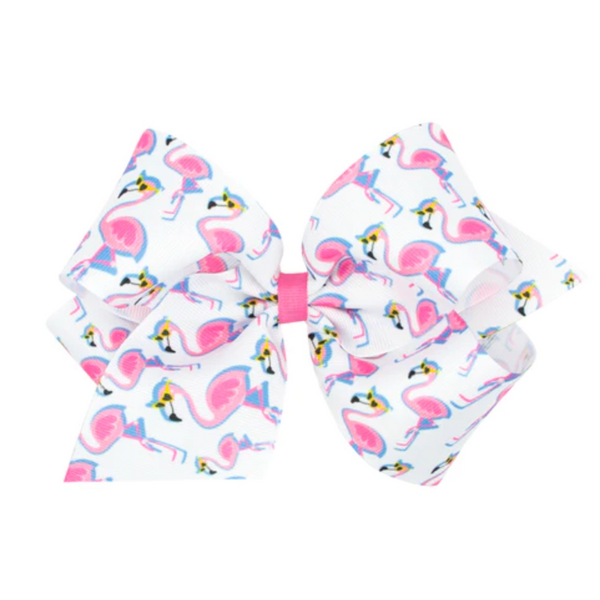 Flamingo printed king size grosgrain bow. Approximate Size: 6.25" x 5" (2.25" Ribbon)