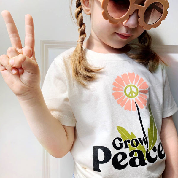Grow Peace Kids Tee and Youth Tee. Available in sizes and styles for the whole family. Details: Printed by Savage Seeds. Sweatshop Free & Made in USA. Colors and Materials: Organic Natural White 100% Cotton
