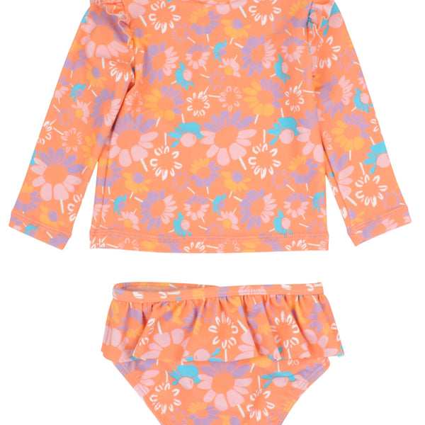 Girls Coral Floral Skirted Flutter Long Sleeve Rash Guard Bikini This 2-piece rash guard with a skirted bottom is the perfect balance of function and fashion. Flutter ruffle details at the sleeves add a sweet touch, and UPF 50+ sun protective fabric will keep her safe in the sun. Pairs perfectly with Coral, Mint, Pink, Bright Aqua, White, and Lavender. This bright floral print is full of fun colors and hand drawn shapes!