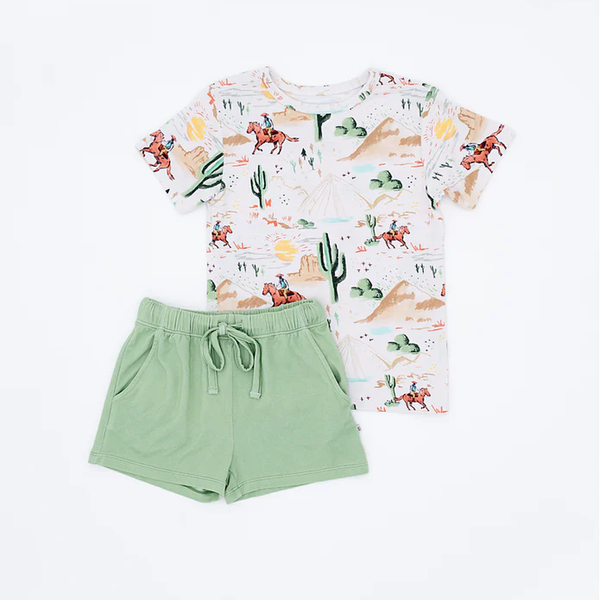 Billy is a cowboy-themed design on a cream background. The t-shirt top comes in the western Billy print and the shorts come in a coordinating light sage green color—and they have pockets!!