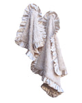 This warm & cozy blanket features a beautiful beige toned crush cuddle on both sides. It is trimmed w/ a luxurious silky satin ruffle.