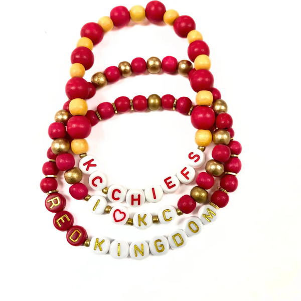 Your lucky charm is here. This stack of Chiefs stretchy bracelets can be worn as a stack or separate. They are made from painted wood beads and letter charms in our Kansas City famous Chiefs colors. Show your pride at the next game in this stack!