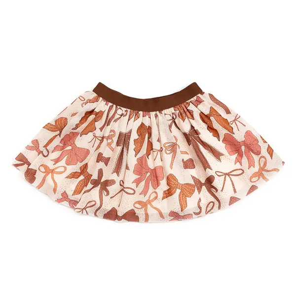 The Bow Party Tutu is a trendy skirt and dress up tutu inspired by the latest bow trend! Features: *Cream tulle printed with a bow party pattern accented with gold glitter pin dots *Cream cotton lining *Chocolate brown elastic waistband *Care: Hand wash and line dry The Sweet Wink difference: *Super soft tulle that doesn’t scratch or itch *Cotton lining provides extra coverage and comfort *“Shed-free” embellishments ensure glitter does not sprinkle around the house