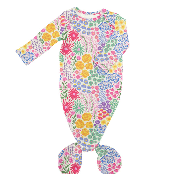95% bamboo, 5% spandex Knotted infant gown with foldable scratch mitts available in 0-3 months.