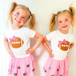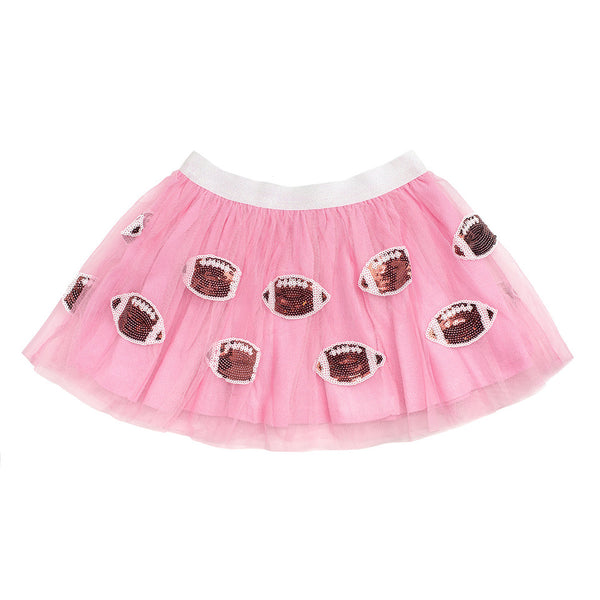 Item Description: -Pink tulle embellished with Sequin Footballs-Pink cotton lining -Gold glitter elastic waistband To keep tutus in tip top shape, it is recommended to hand wash and hang dry