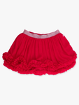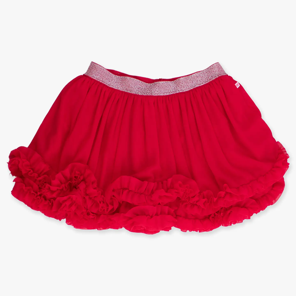 This skirt is made for girls who love to twirl! Multiple layers of soft tulle add volume to the skirt, and the ruffle hem adds that extra girly touch. The elastic waistband ensures all-day comfort. You can't go wrong with this beautiful, classic red. Perfect for adding a pop of color into an outfit! Care Instructions: Machine wash cold; only non-chlorine bleach when needed; tumble dry low Fabric Content: Shell: 100% Polyester; Lining: 95% Cotton, 5% Spandex