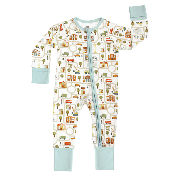 The softest bamboo baby pajamas in our Let's Go pattern! This city themed print is perfect for fall and winter. Check out more with this print for the cutest sibling match!