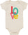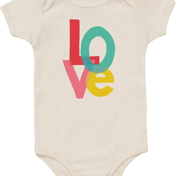 100% certified organic bodysuit with a colorful LOVE water based eco-friendly screen print. No thick plastic screen prints here... These water based prints fuse into the fabric leaving it super soft to the touch!