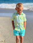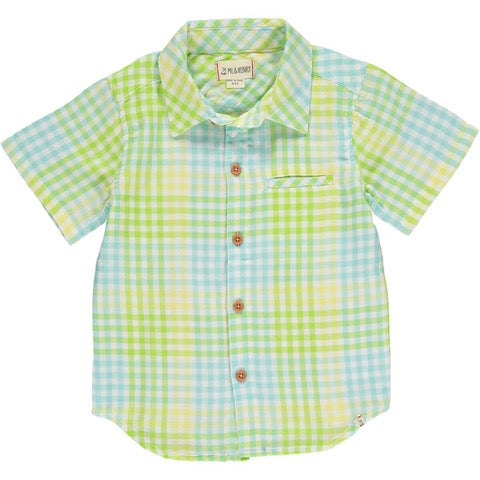 Lemon, lime and blue plaid button down shirt with front pocket.  Love the Color!