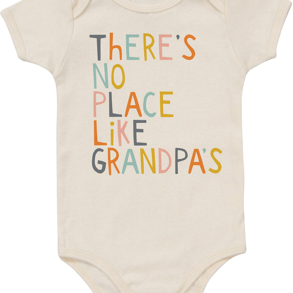 100% certified organic bodysuit with a colorful There's No Place Like Grandpa's water based eco-friendly screen print. No thick plastic screen prints here... These water based prints fuse into the fabric leaving it super soft to the touch!