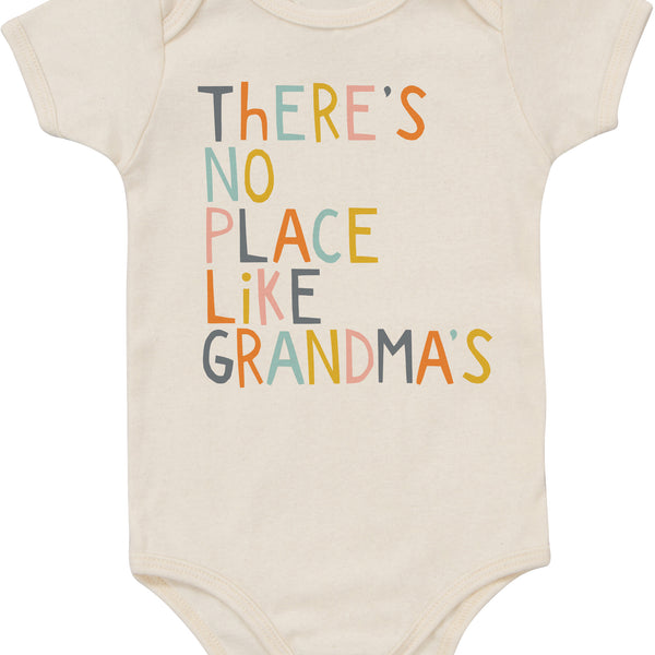 100% certified organic bodysuit with a colorful There's No Place Like Grandmas water based eco-friendly screen print. No thick plastic screen prints here... These water based prints fuse into the fabric leaving it super soft to the touch!