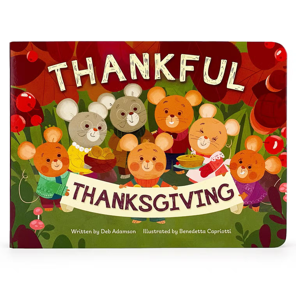 Yummy food and football games and family that's come to play - What are you thankful for on this Thanksgiving Day? A little mouse is thankful for their friends and family, good food to share, and fun games to play. This warm and inviting fall picture book is a wonderful way to start a family conversation about being grateful and kind, not just at Thanksgiving but all year long! A perfect gift to bring to begin to fall family celebrations or celebrate a baby's first Thanksgiving. Plus it's made in America! Check out more Thanksgiving and holiday board books from Cottage Door Press! Teach your children the importance of thankfulness and gratitude in this adorable board book that's made in America!